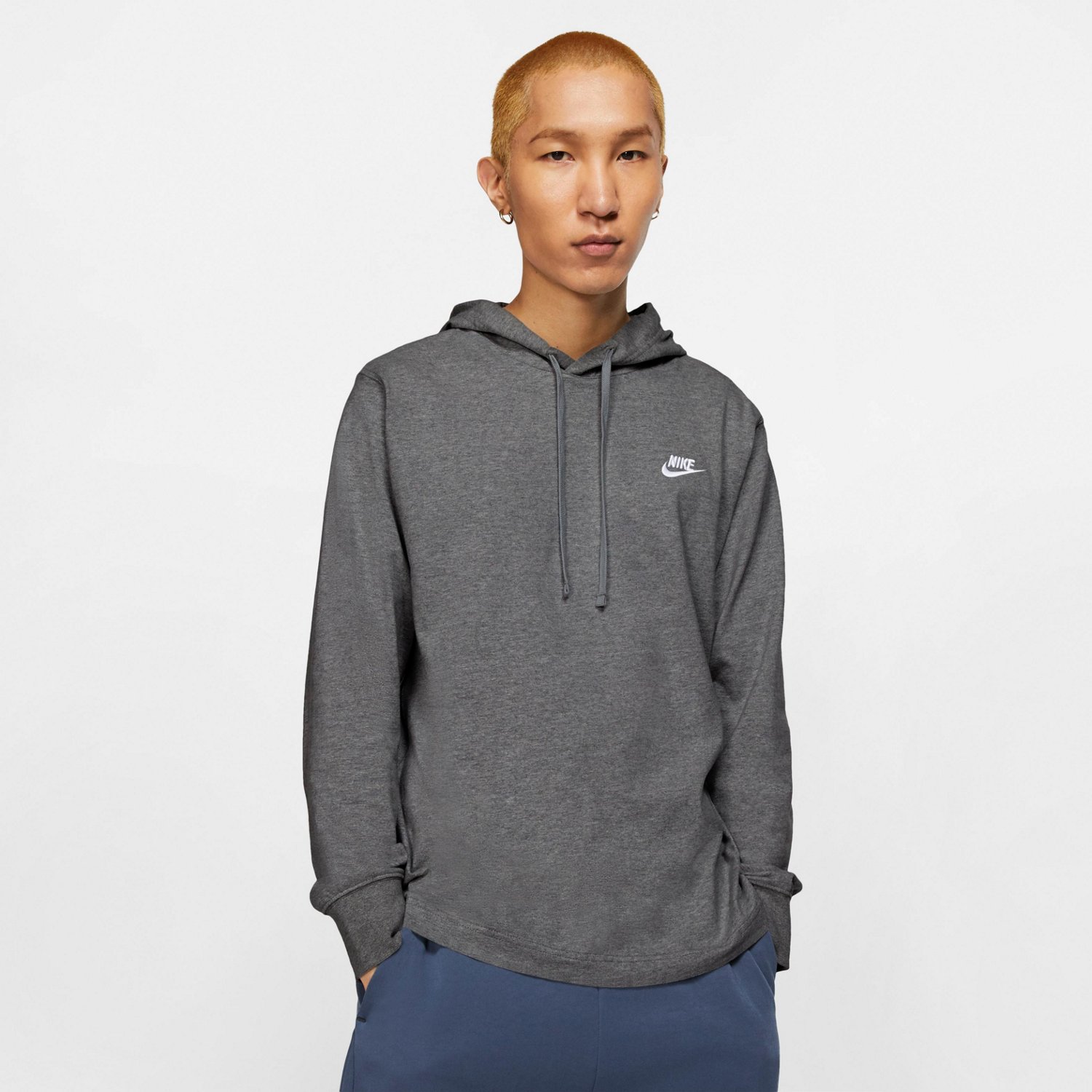Stay warm while staying active in the Nike Men's Sportswear Club Pullover Jersey Hoodie. This hoodie is crafted from 100% soft cotton jersey for a comfortable wear that is perfect for layering. The hood with drawstring offers adjustable coverage, and the ribbing around the hem and cuffs provides a more secure fit.