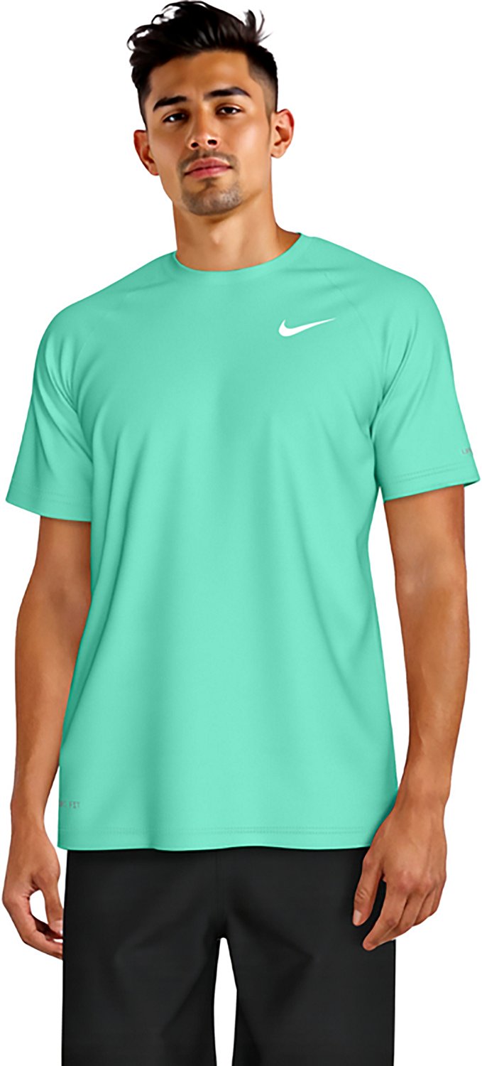 Take your training outdoors with the Nike Men's Swim Essential Short Sleeve Hydroguard. Constructed with interlock knit fabric, this swim shirt provides stretchy comfort, while the Dri-FIT technology wicks away sweat to keep you cool and dry. UPF 40+ protection shields against harmful UV rays, and the heat-transferred Nikeâ„¢ Swoosh design delivers a stylish touch.