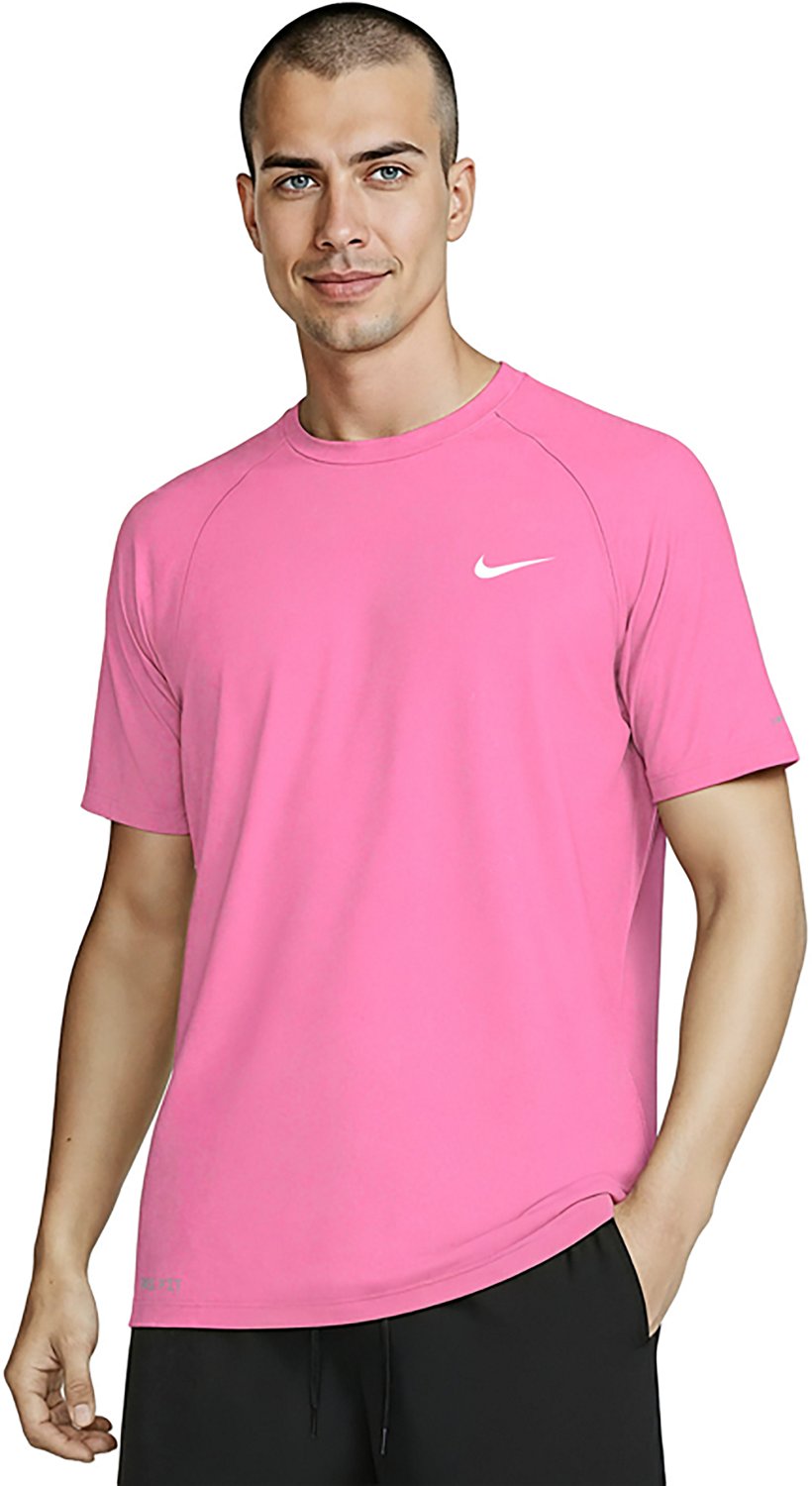Take your training outdoors with the Nike Men's Swim Essential Short Sleeve Hydroguard. Constructed with interlock knit fabric, this swim shirt provides stretchy comfort, while the Dri-FIT technology wicks away sweat to keep you cool and dry. UPF 40+ protection shields against harmful UV rays, and the heat-transferred Nikeâ„¢ Swoosh design delivers a stylish touch.