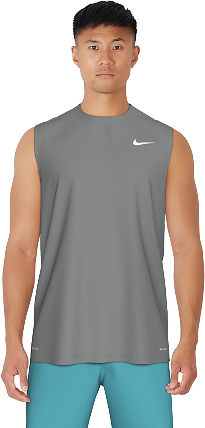 Take your training outdoors with the Nike Men's Swim Essential Sleeveless Hydroguard. Constructed with interlock knit fabric, this swim shirt provides stretchy comfort, while the Dri-FIT technology wicks away sweat to keep you cool and dry. UPF 40+ protection shields against harmful UV rays, and the heat-transferred Nikeâ„¢ Swoosh design delivers a stylish touch.