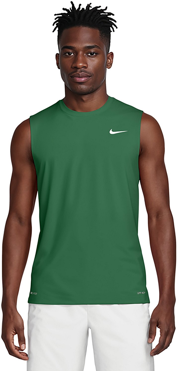 Take your training outdoors with the Nike Men's Swim Essential Sleeveless Hydroguard. Constructed with interlock knit fabric, this swim shirt provides stretchy comfort, while the Dri-FIT technology wicks away sweat to keep you cool and dry. UPF 40+ protection shields against harmful UV rays, and the heat-transferred Nikeâ„¢ Swoosh design delivers a stylish touch.