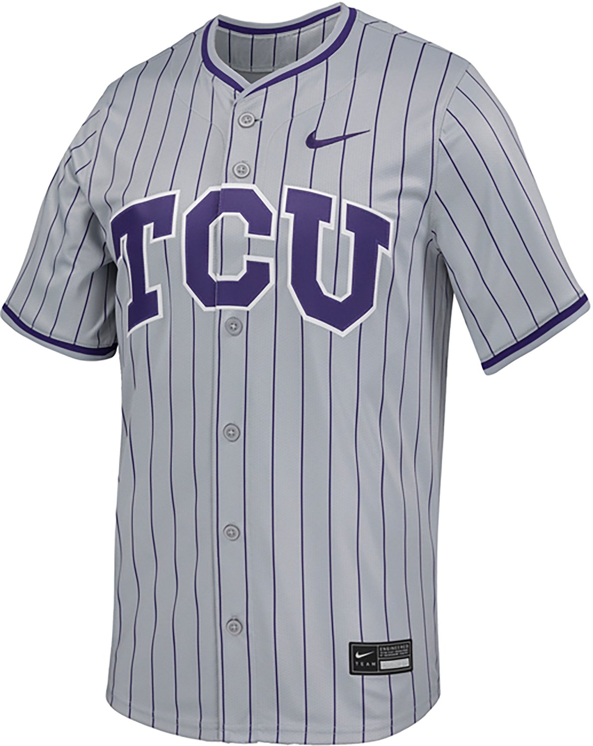 You can showcase your fandom for all to see by wearing the Nike Men's TCU Limited Full Button Pinstripe Baseball Jersey. This jersey is made of 100% polyester to provide a soft feel and features a team theme that will help you show support.