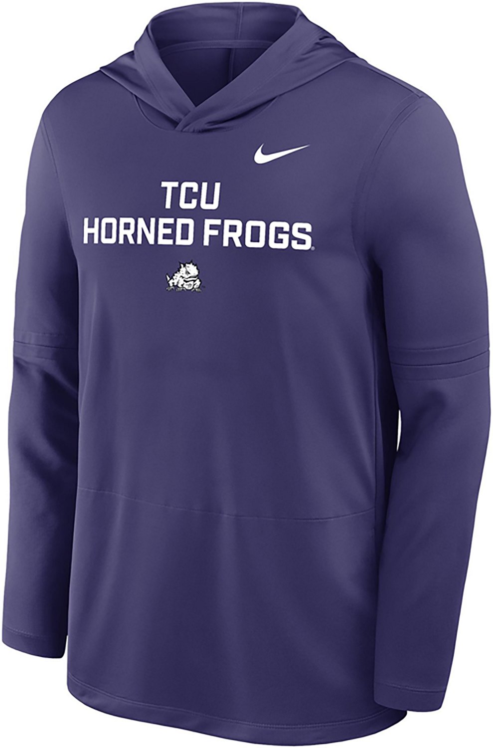 Get your game face ready and cheer along with friends by wearing the Nike Men's TCU School Dri-FIT Lightweight Hooded Long Sleeve Top. This top is made of lightweight fabric with Dri-FIT technology to help wick away moisture and features a school-based screen print to let your loyalty shine through.