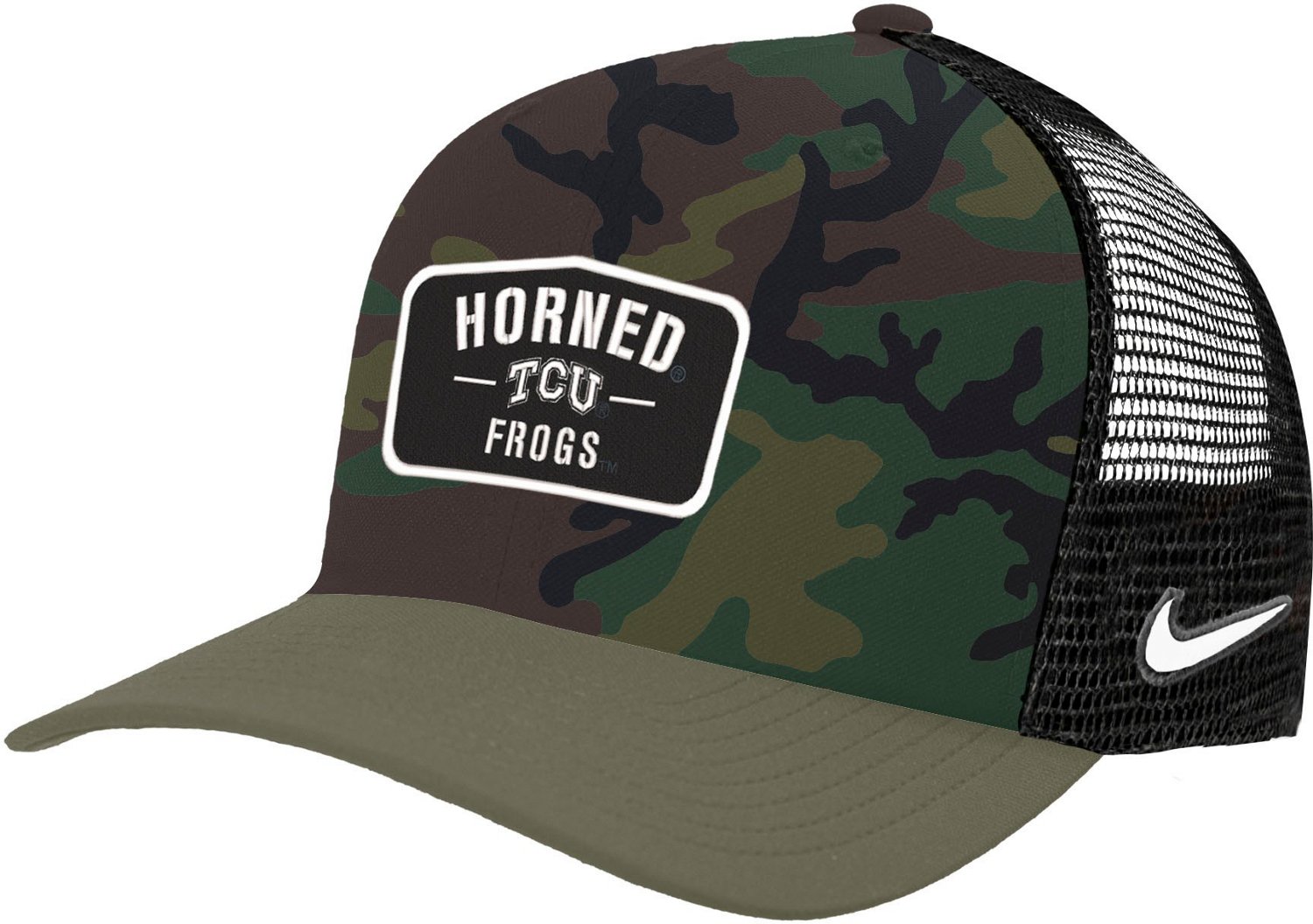 Put on the Nike Men's Texas Christian University Military Trucker Cap and celebrate each and every Horned Frogs win. The cap is made of cotton twill and polyester with trucker mesh to offer all-day comfort and airflow, and the TCU team design helps true fans prove their loyalty game after game.