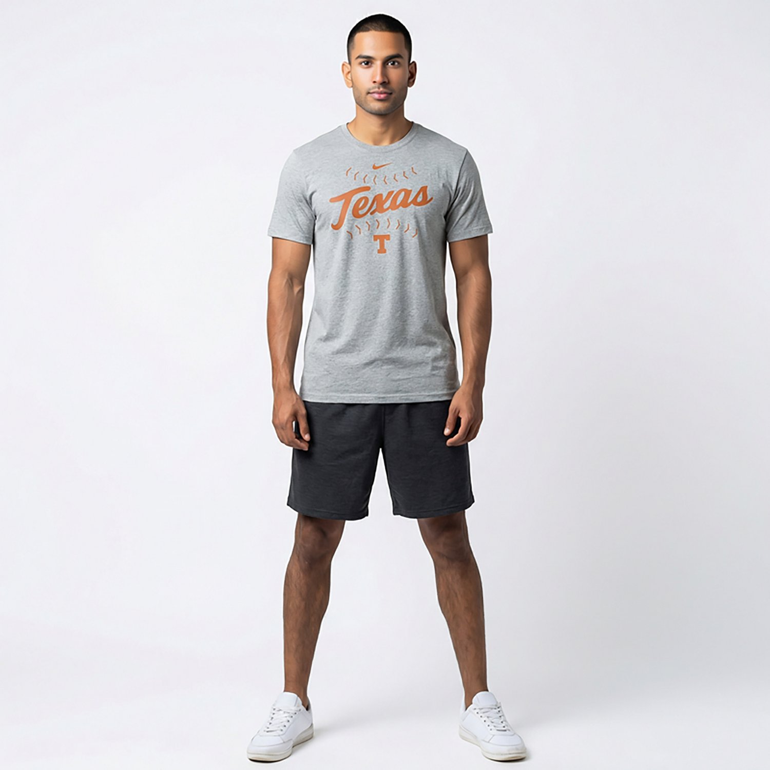 Features and Benefits Short sleeves Crew neck Team design showcases your fandom Specifications Neckline: Crew Neck Product Type: Shirts Sleeve length: Short Sleeve Age Group: Adults' Style: Graphic Tees Activity: College Sports,Baseball Material: Tri-Blend Gender: Men's Size Range: Men's Hood: No What's in the Box Nike Men's Texas Script Baseball T-shirt