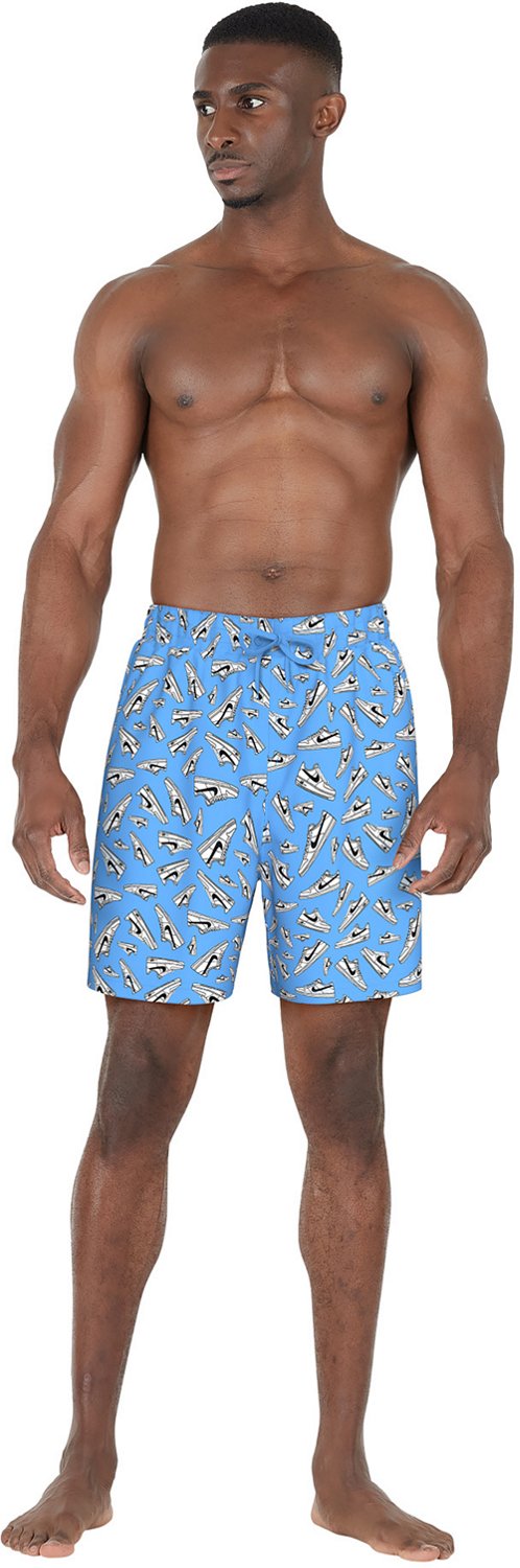 Splash around in the Nike Men's Tossed Sneakers Volley Swim Shorts 7 in. Their fabric is water resistant. The body is made of 100% recycled nylon, and their lining is made of 100% recycled polyester. The sneaker print all over adds a touch of design.