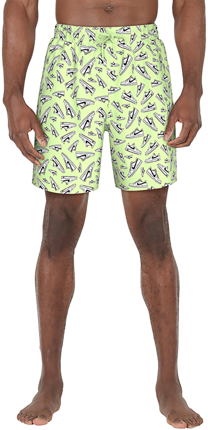 Splash around in the Nike Men's Tossed Sneakers Volley Swim Shorts 7 in. Their fabric is water resistant. The body is made of 100% recycled nylon, and their lining is made of 100% recycled polyester. The sneaker print all over adds a touch of design.