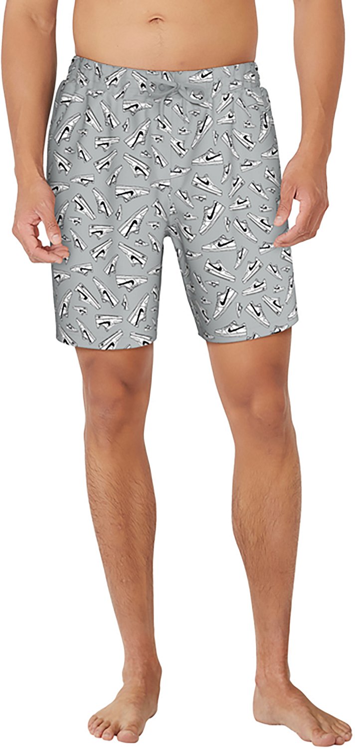 Splash around in the Nike Men's Tossed Sneakers Volley Swim Shorts 7 in. Their fabric is water resistant. The body is made of 100% recycled nylon, and their lining is made of 100% recycled polyester. The sneaker print all over adds a touch of design.
