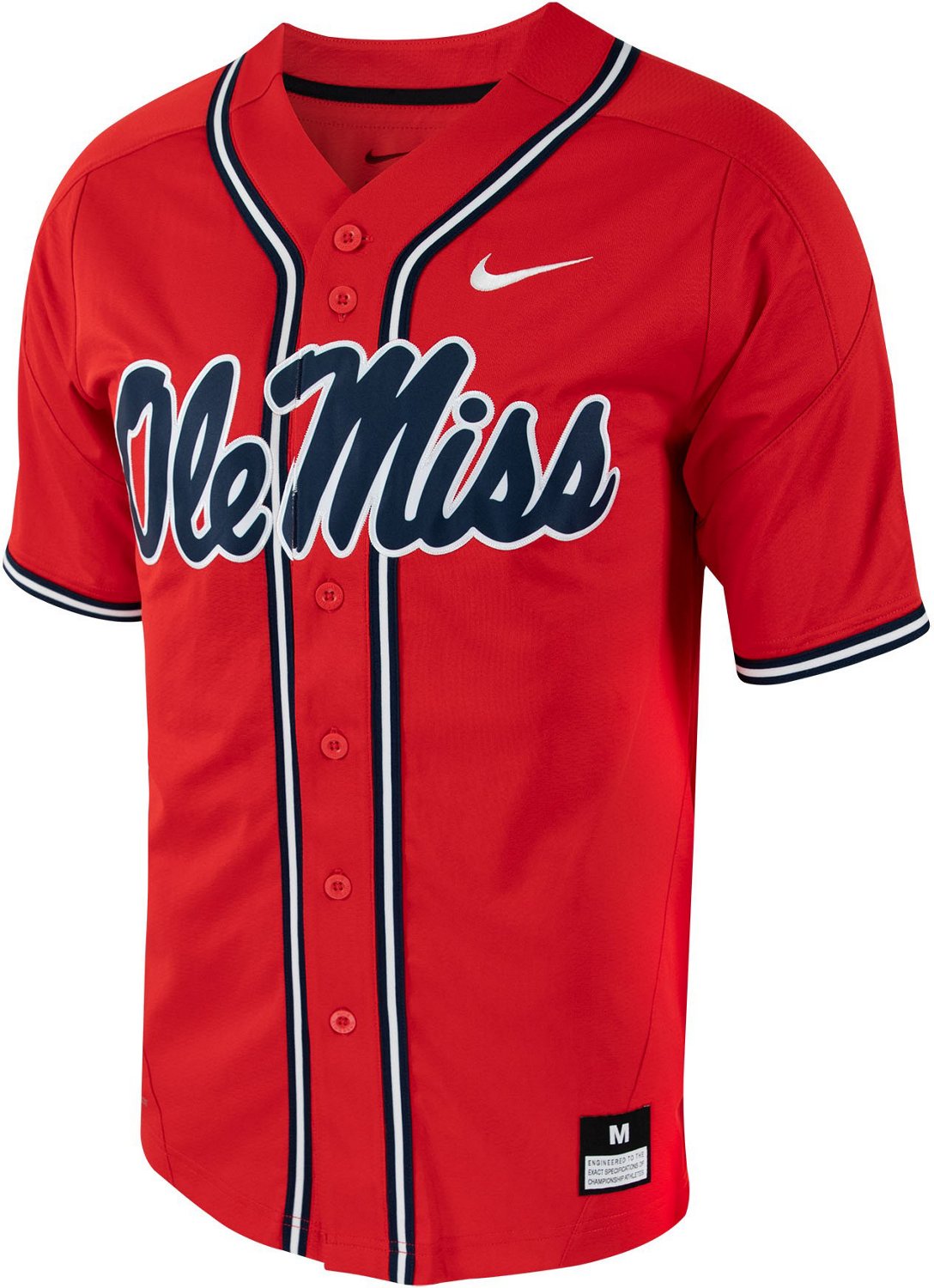 Bring attention to your excitement for Ole Miss Rebels baseball with this full-button replica jersey from Nike It features official Ole Miss Rebels graphics on soft fabric Plus moisture-wicking Dri-FIT technology keeps you feeling dry and cool