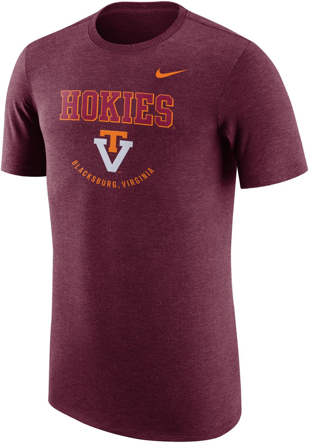 The Nike Men's Virginia Tech TriBlend Short Sleeve T-shirt is great for Hokies fans. Made of 50% polyester, 25% cotton and 25% rayon, this T-shirt features Nike Dri-FIT technology to move sweat away from your skin. The T-shirt also comes with a team graphic on the front to add style.
