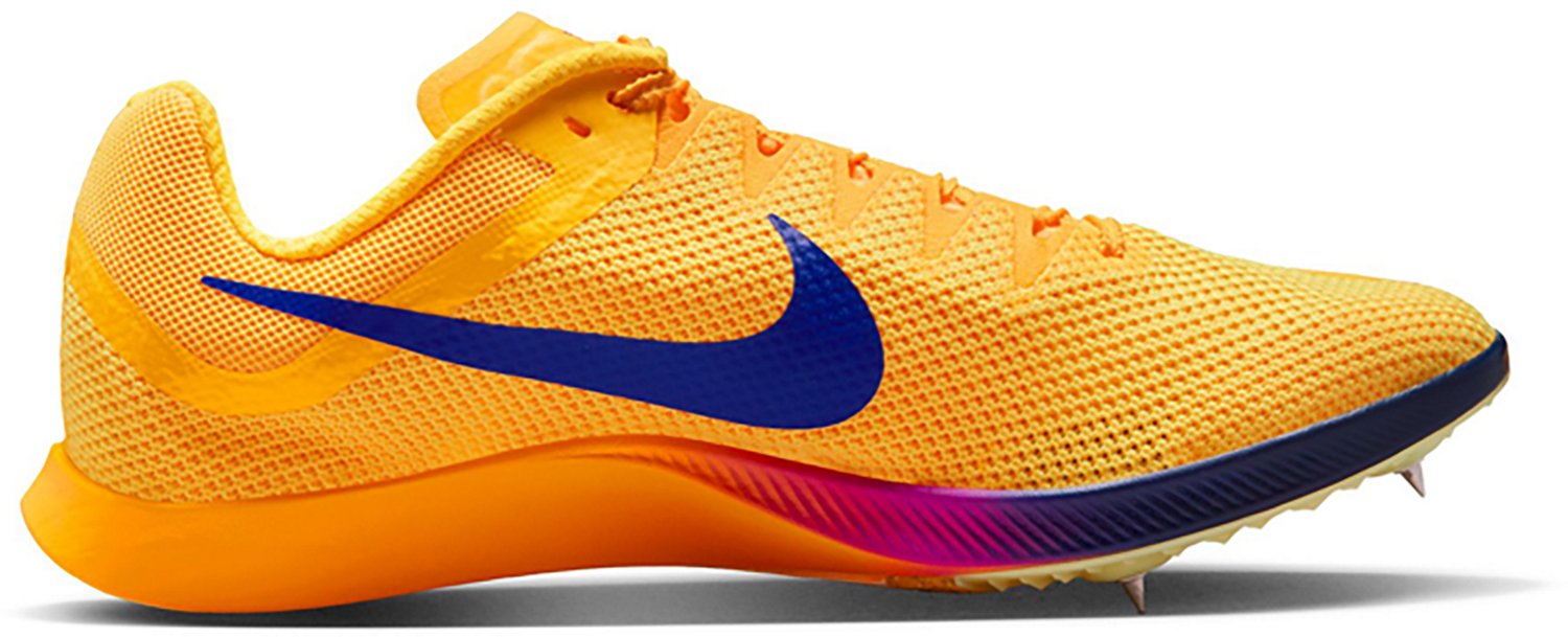 Race to the finish line in the Nike Adults' Zoom Rival Distance Track Spikes. Lightweight mesh uppers help your feet stay cool. Cushioned midfoot and heel areas provide comfort, protection and smooth transitions. Compatible with most track surfaces, the replaceable Dragonfly spikes promote explosive traction. Lace closures.