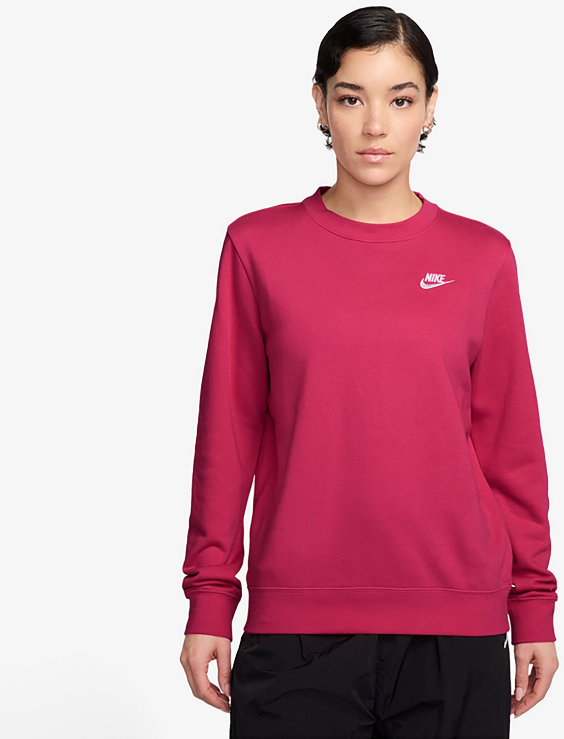 Take on the day in comfy style when you sport the Nike Women's Nike Sportswear Club Fleece Pullover Sweatshirt. The cotton and polyester brushed fleece fabric offers softness and warmth. The ribbed hem and cuffs create a snug fit. The standard silhouette supplies a relaxed, easy feel, while the embroidered logo design adds a classic, stylish appearance to your look.