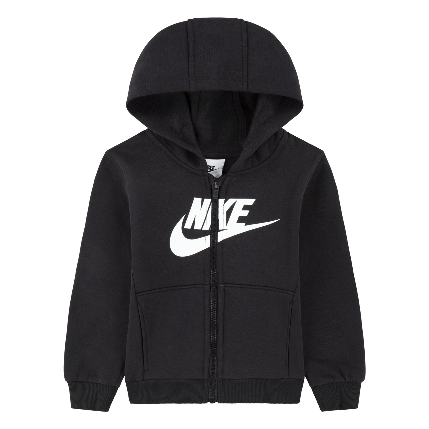 The Nike Toddler Boys' Club Fleece HBR Full-Zip Hoodie is a great layer on chilly days. Made from soft fleece, the hoodie provides a warm, comfortable feel. It has a full zipper closure for easy on/off and ribbed detailing on the sleeves. A classic Nike Swoosh design logo on the chest adds a sporty touch.