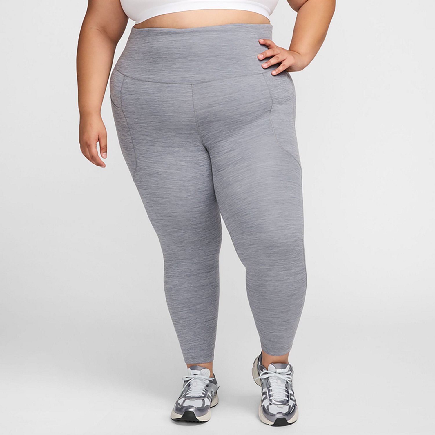 Stay cool and dry while working out in the Nike Women's Dri-FIT High-Waisted Plus Size 7/8 Leggings with Pockets. These leggings are made with a nonsheer, moisture-wicking material designed to provide full coverage and to keep sweat away. The leggings are made with fewer seams to create a smooth and flattering fit you can wear all day.