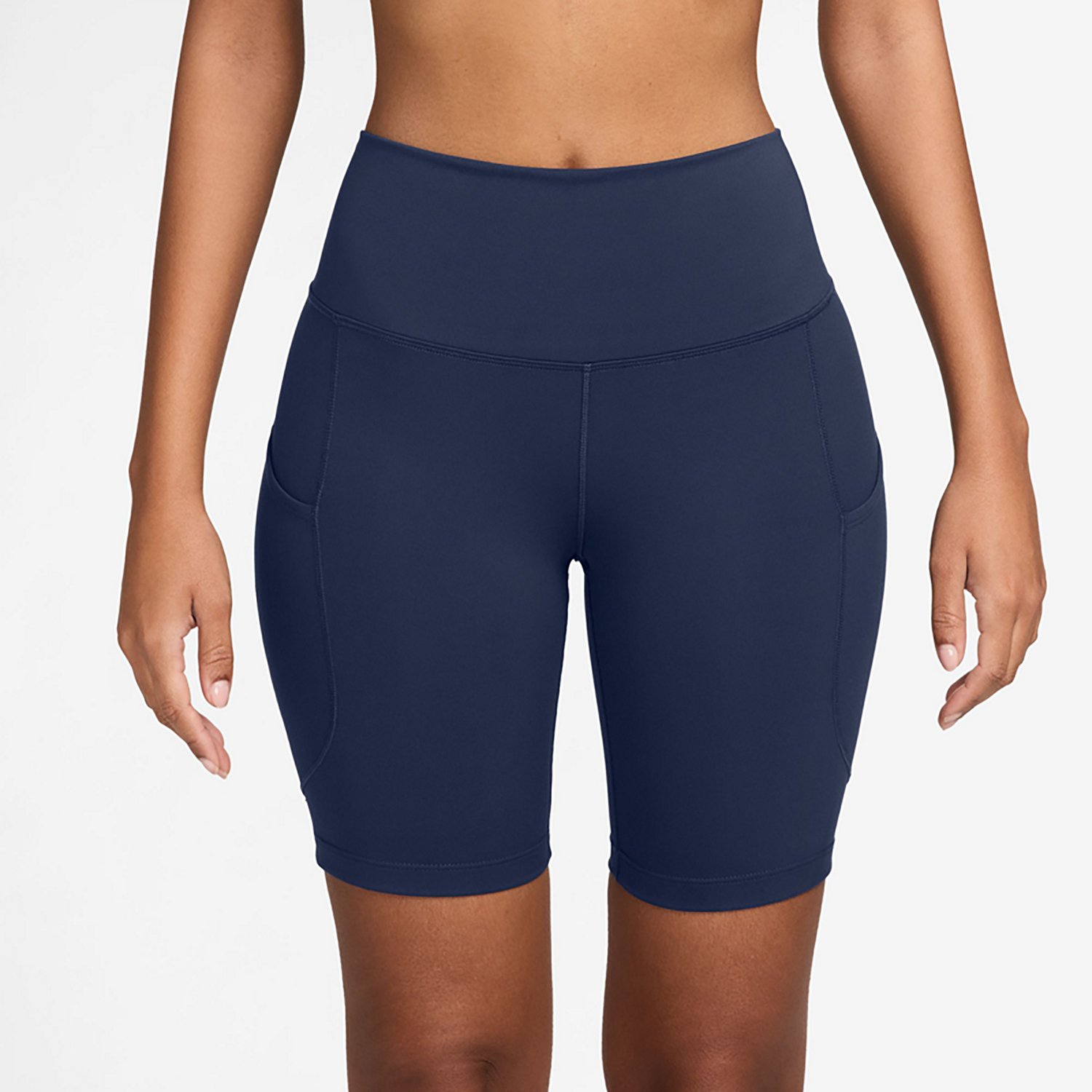 Feel comfortable and confident while working out in the Nike Women's Dri-FIT High-Waisted Pocket Biker Shorts 8 in. These shorts are made with a blend of polyester and spandex for a lightweight feel that stretches as you move, and the nonsheer, high-waisted design offers full coverage. The moisture-wicking fabric keeps you cool and dry, and the minimal-seam design provides a flattering fit.
