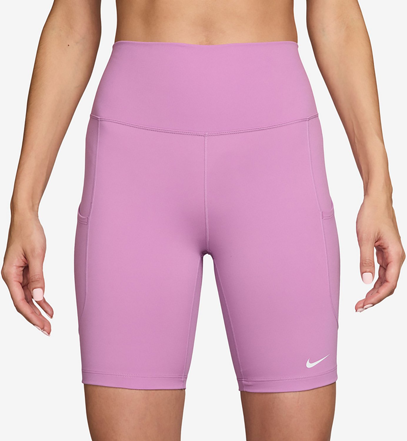 Feel comfortable and confident while working out in the Nike Women's Dri-FIT High-Waisted Pocket Biker Shorts 8 in. These shorts are made with a blend of polyester and spandex for a lightweight feel that stretches as you move, and the nonsheer, high-waisted design offers full coverage. The moisture-wicking fabric keeps you cool and dry, and the minimal-seam design provides a flattering fit.