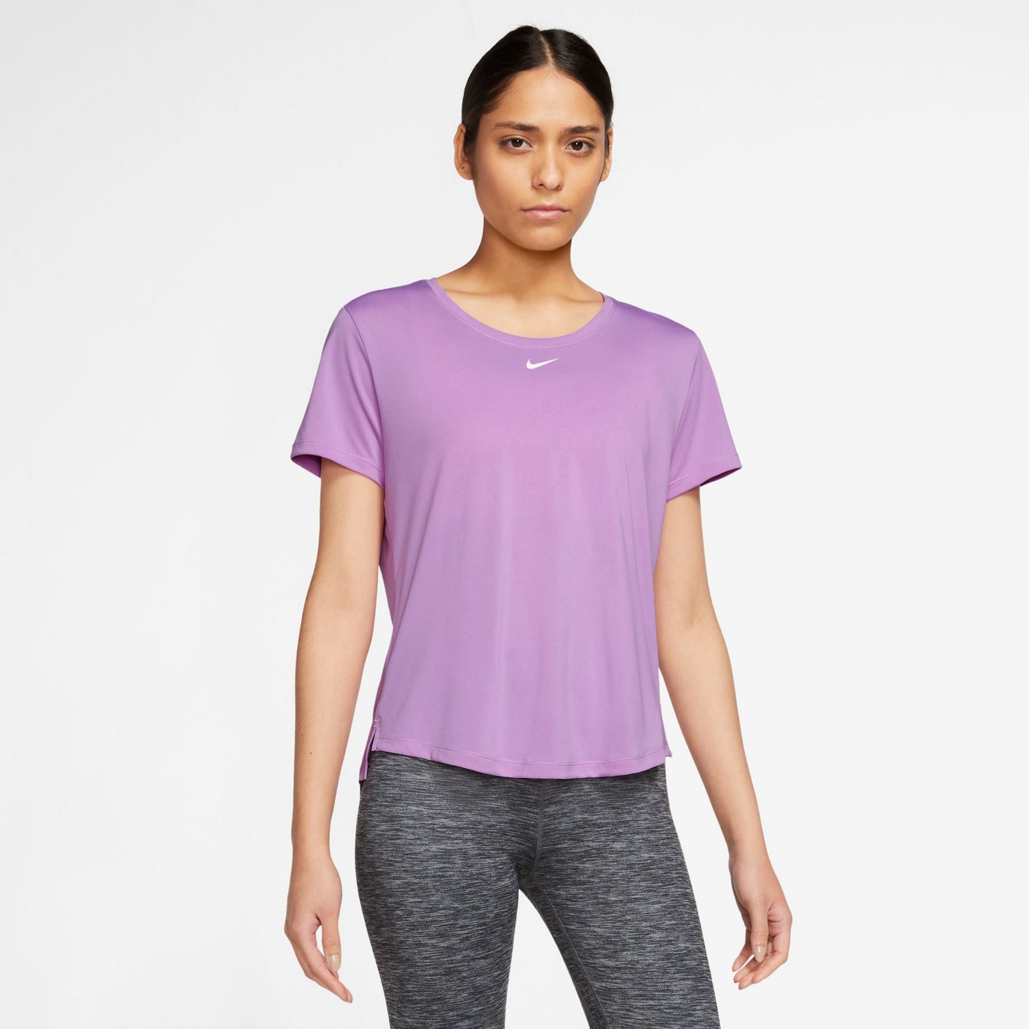 Take on your workout in style and comfort when you train in the Nike Women's Dri-FIT One Standard Fit Short Sleeve Top. The 100% polyester fabric offers soft, lightweight wear. The Dri-FIT technology wicks sweat to help keep you dry and comfortable. The curved back hem helps ensure coverage as you move, while the printed design adds a stylish appearance to your look.