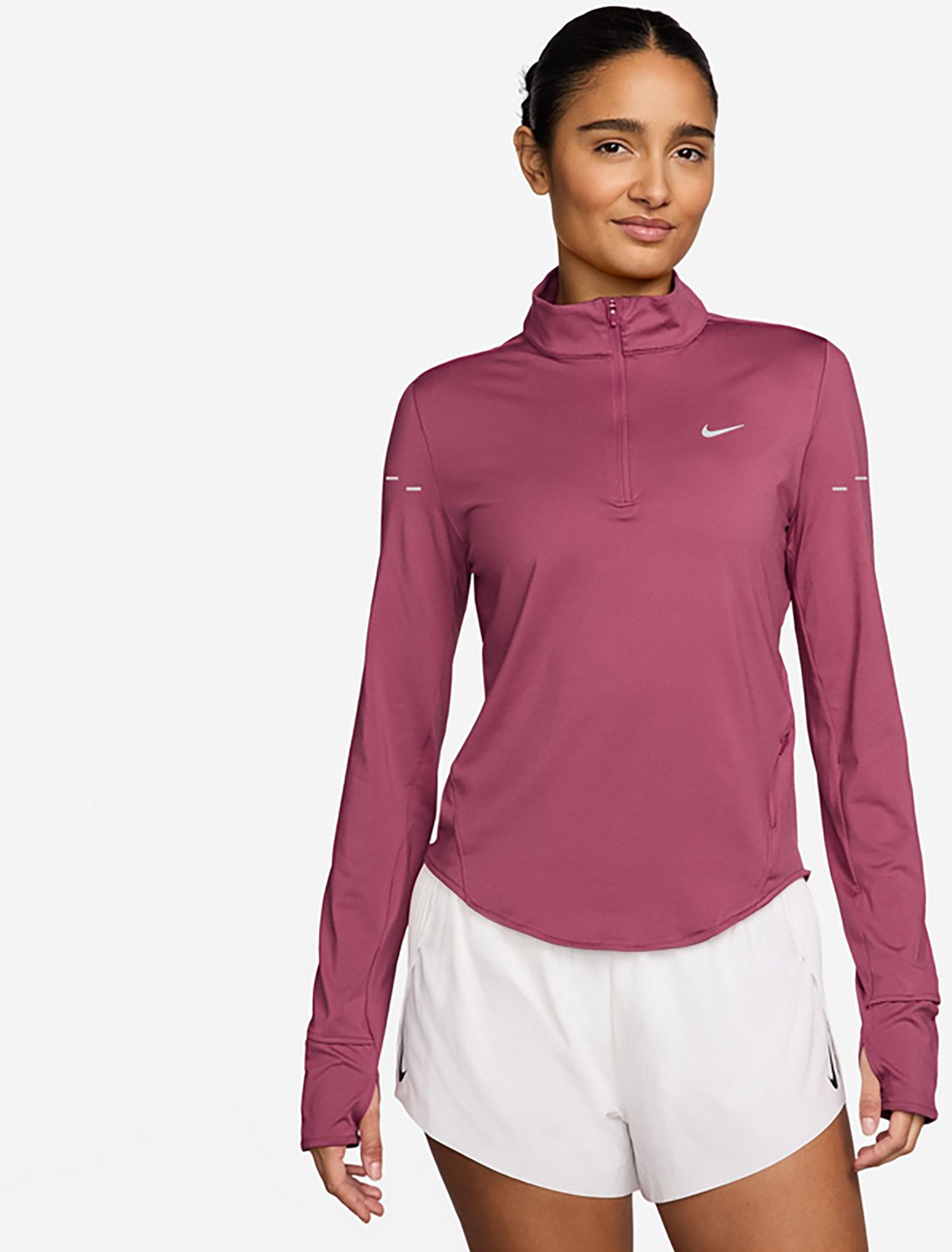 Take on your run in the Nike Women's Dri-FIT Swift Running Shirt. It is made of 88% polyester and 12% spandex. The Dri-FIT technology moves sweat away from your skin for quicker evaporation, and its neckline has a 1/4-length zipper with zipper guard. The modified raglan long sleeves are designed to help reduce underarm chafing.