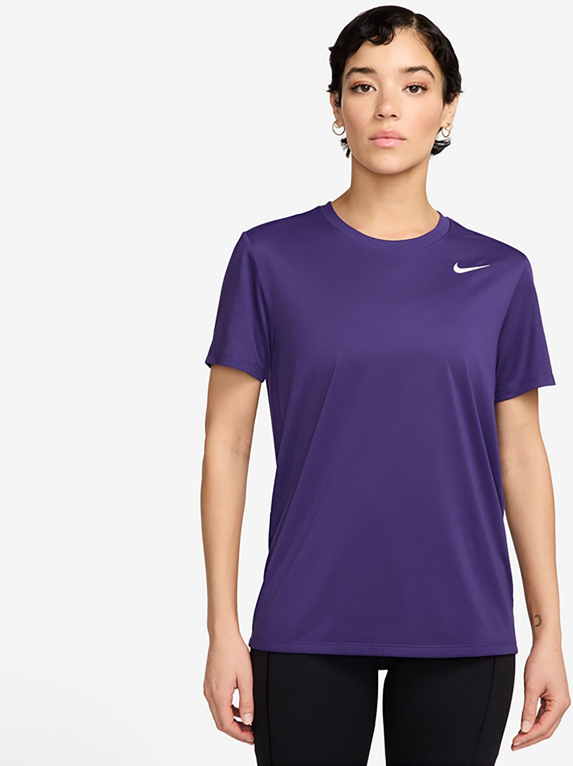 Turn up the heat without worry in the Nike Women's Dri-FIT Legend T-shirt. The Dri-FIT technology wicks away moisture to keep you dry and the polyester fabric offers smooth comfort.