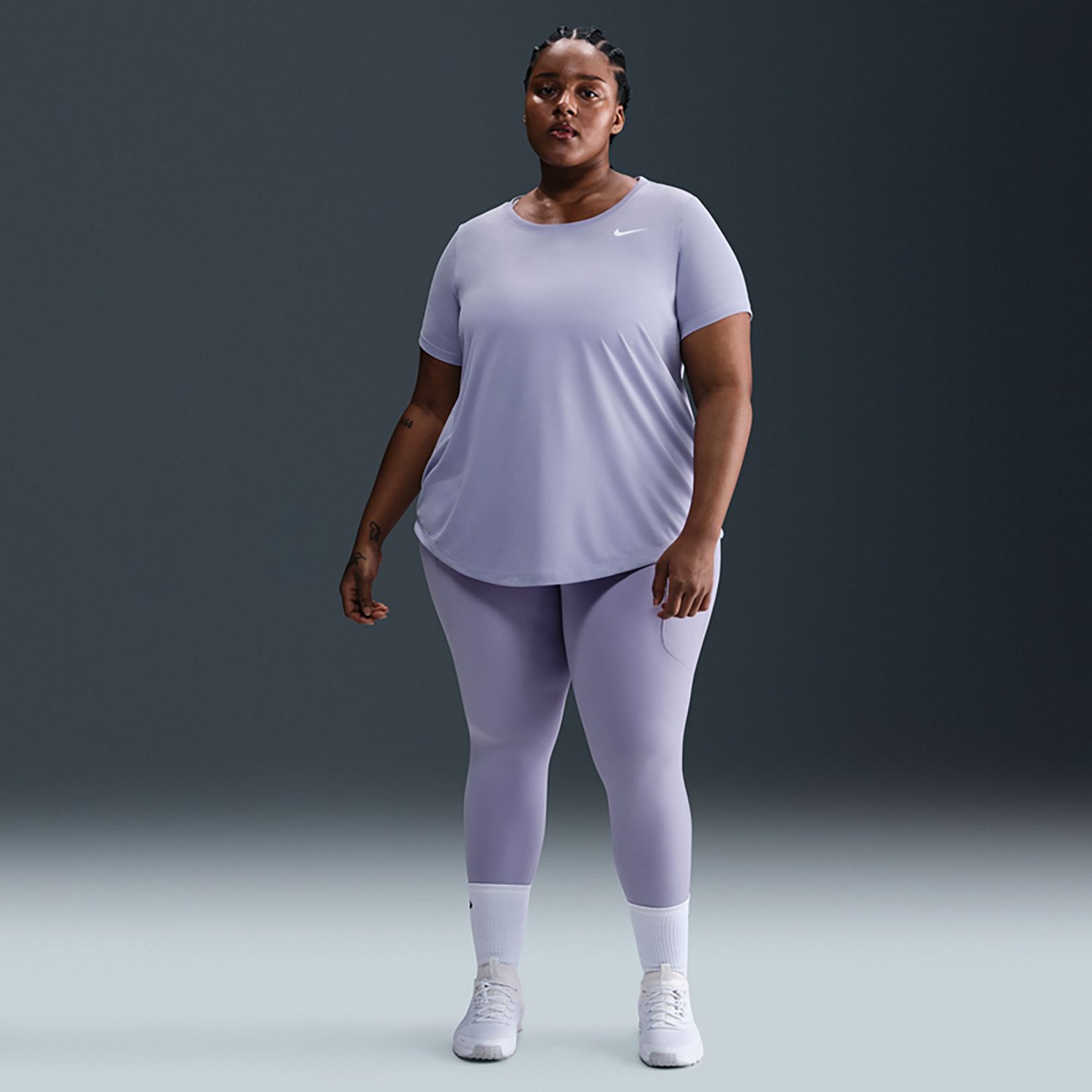 Train to win with the Nike Women's Plus Dri-FIT T-shirt. The sleek polyester fabric features Dri-FIT moisture-wicking technology to keep you cool and comfortable throughout your workout. A printed Swoosh graphic showcases your brand love.