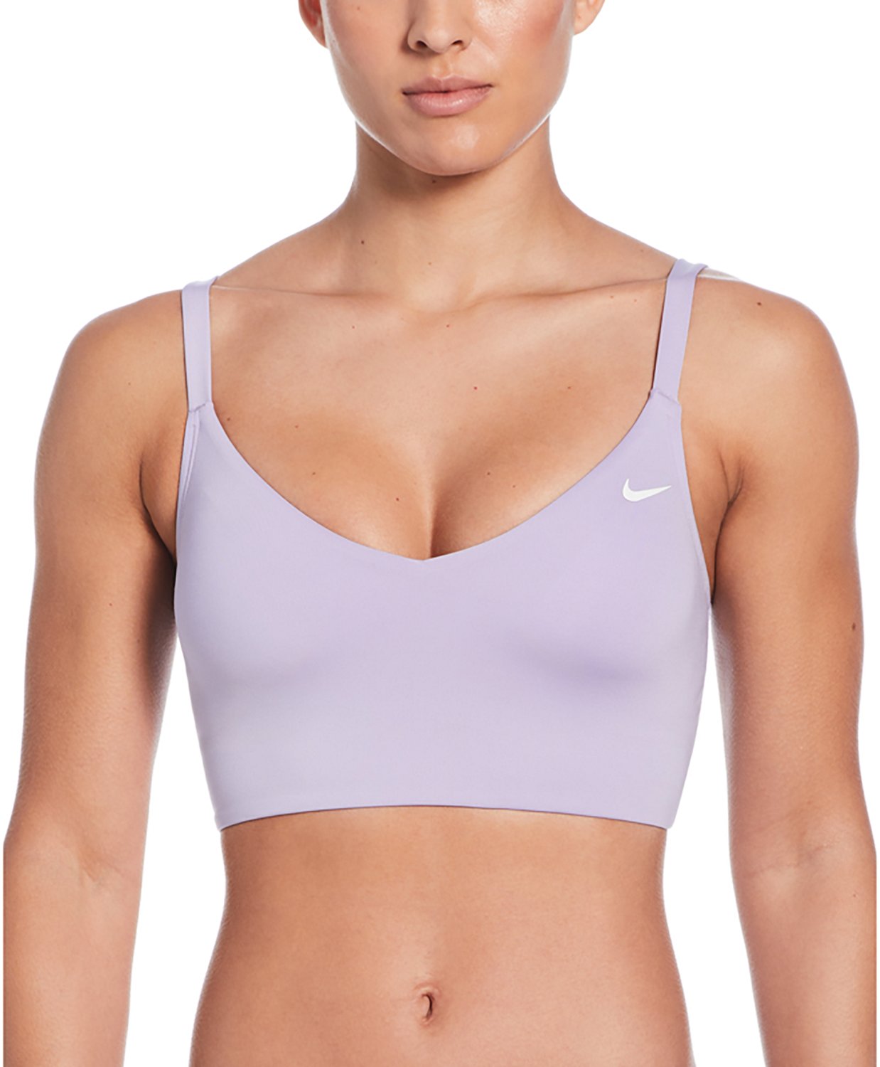 This Nike Women's Effortless Essential V-Neck Midkini Swim Top offers customizable comfort. The top is made of 83% recycled polyester and 17% spandex for durability and a stretchy fit, and the top boasts an adjustable profile with removable bra cups for a comfortable fit.