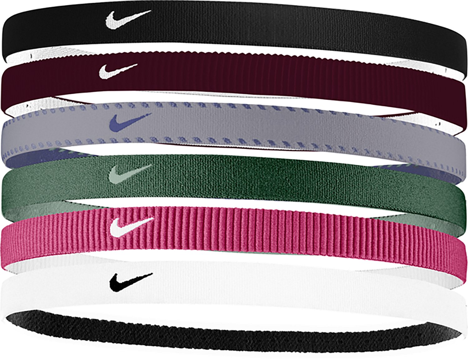 Stay focused with the Nike Women's Flex Classic Headbands - 6 Pack. This grippy headbands are made of a polyester, spandex and rubber blend to keep your hair out of your face as you workout, run errands or relax. The silicone band stays in place, no matter what lies ahead, and the colors add style to any outfit.