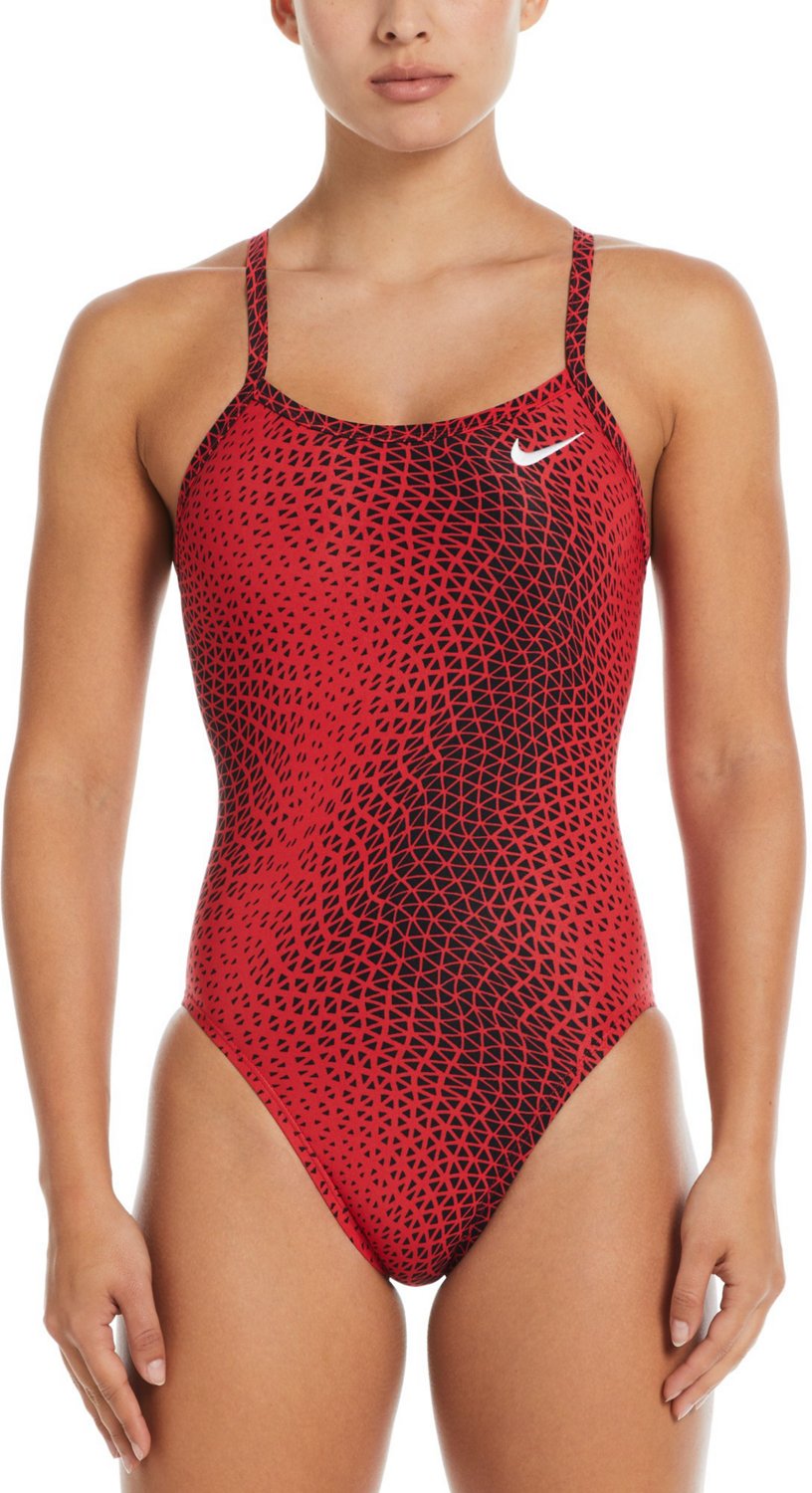 Your team will leave competition in the dust in the Nike Women's HydraStrong Delta Racerback One Piece Piece Swimsuit. The recycled polyester and polyester lining helps you feel covered, and a polyester and PBT polyester HydraStrong construction withstands wear and tear while feeling comfortable. The Swoosh detail and graphic design highlight an eye-catching appearance, and the high-leg height sits above your hips, allowing you to move and swim without restrictions.