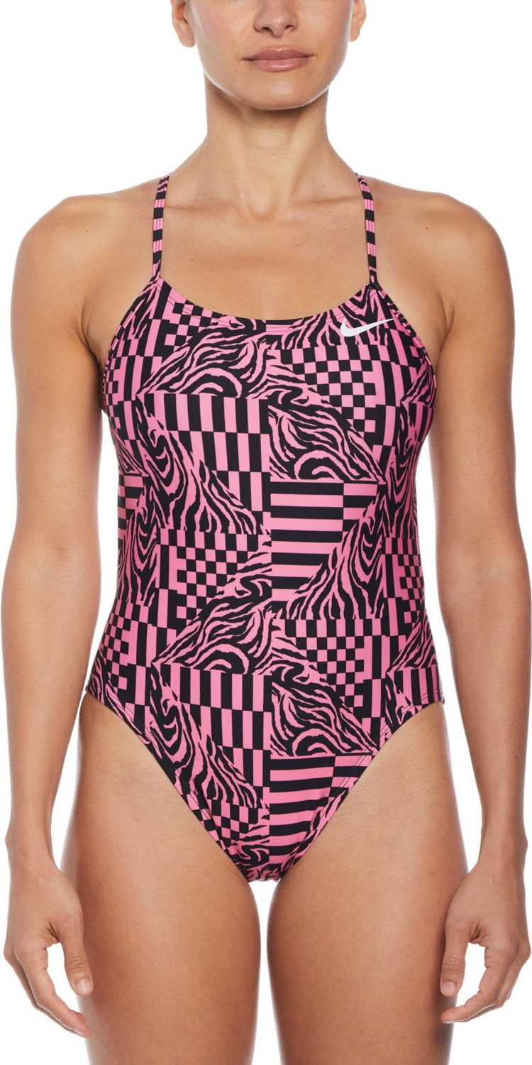 Head to your next swim meet sporting the Nike Women's HydraStrong Multi Print Cutout One Piece Swimsuit. The recycled polyester and elastolefin HydraStrong construction withstands wear and tear while feeling comfortable, and the Swoosh detail and psychedelic design highlight an eye-catching appearance. The recycled polyester lining helps you feel covered, and the high-leg height sits above your hips, allowing you to move and swim without restrictions.