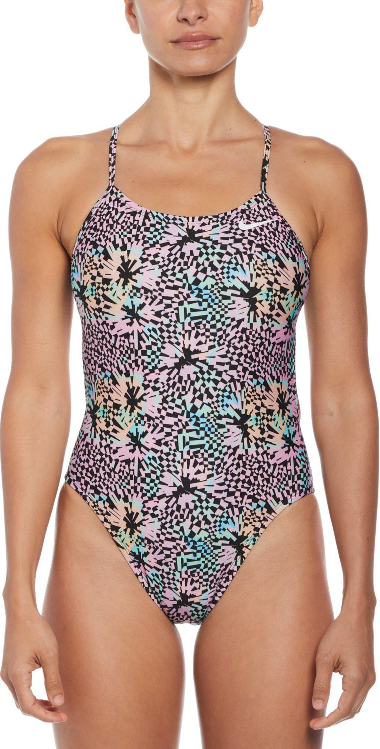 Head to your next swim meet sporting the Nike Women's HydraStrong Multi Print Cutout One Piece Swimsuit. The recycled polyester and elastolefin HydraStrong construction withstands wear and tear while feeling comfortable, and the Swoosh detail and psychedelic design highlight an eye-catching appearance. The recycled polyester lining helps you feel covered, and the high-leg height sits above your hips, allowing you to move and swim without restrictions.