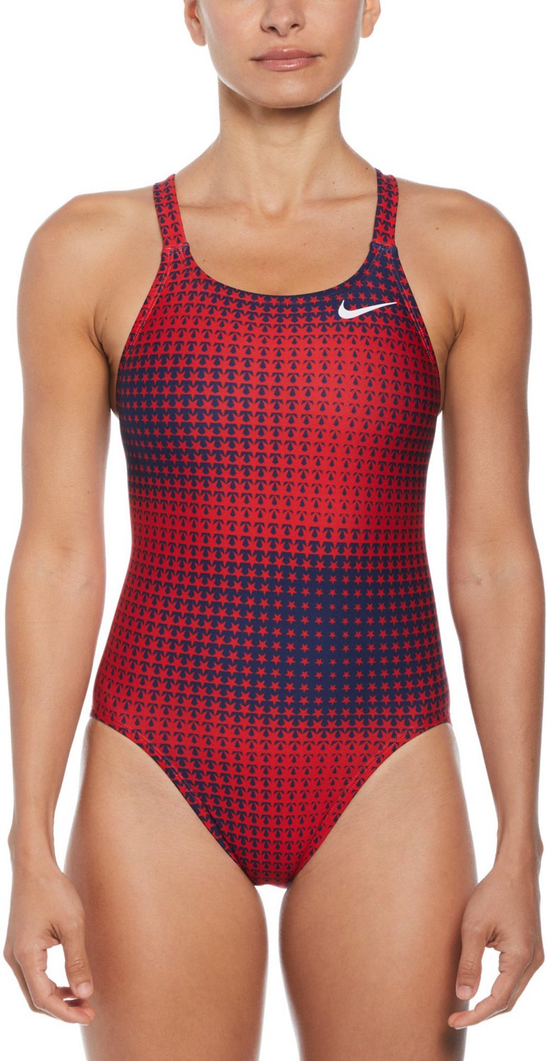Head to your next swim meet sporting the Nike Women's HydraStrong Multi Print Cutout One Piece Swimsuit. The recycled polyester and elastolefin HydraStrong construction withstands wear and tear while feeling comfortable, and the Swoosh detail and psychedelic design highlight an eye-catching appearance. The recycled polyester lining helps you feel covered, and the high-leg height sits above your hips, allowing you to move and swim without restrictions.