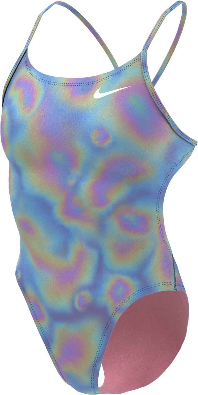 Head to your next swim meet sporting the Nike Women's HydraStrong Multi Print Cutout One Piece Swimsuit. The recycled polyester and elastolefin HydraStrong construction withstands wear and tear while feeling comfortable, and the Swoosh detail and psychedelic design highlight an eye-catching appearance. The recycled polyester lining helps you feel covered, and the high-leg height sits above your hips, allowing you to move and swim without restrictions.