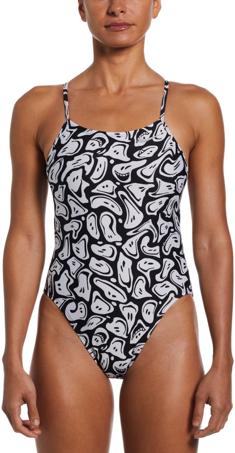 Head to your next swim meet sporting the Nike Women's HydraStrong Multi Print Cutout One Piece Swimsuit. The recycled polyester and elastolefin HydraStrong construction withstands wear and tear while feeling comfortable, and the Swoosh detail and psychedelic design highlight an eye-catching appearance. The recycled polyester lining helps you feel covered, and the high-leg height sits above your hips, allowing you to move and swim without restrictions.