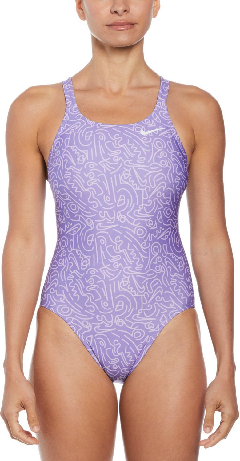 Head to your next swim meet sporting the Nike Women's HydraStrong Multi Print Fastback One Piece Swimsuit. The recycled polyester and elastolefin HydraStrong construction withstands wear and tear while feeling comfortable, and the Swoosh detail and psychedelic design highlight an eye-catching appearance. The recycled polyester lining helps you feel covered, and the high-leg height sits above your hips, allowing you to move and swim without restrictions.