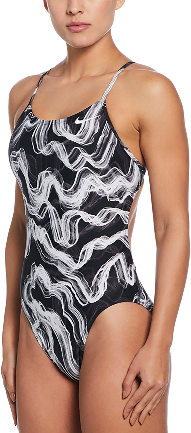 Swim laps around the competition in the Nike Women's Lightning Cutout Swimsuit. This stretchy one-piece is made of a lightweight polyester blend that won't weigh you down in the water. The scoop neck and patterned print help you stand out, while the high-cut leg and minimal back help you swim freely. The polyester liner and narrow straps keep you covered, so you can focus on your training.