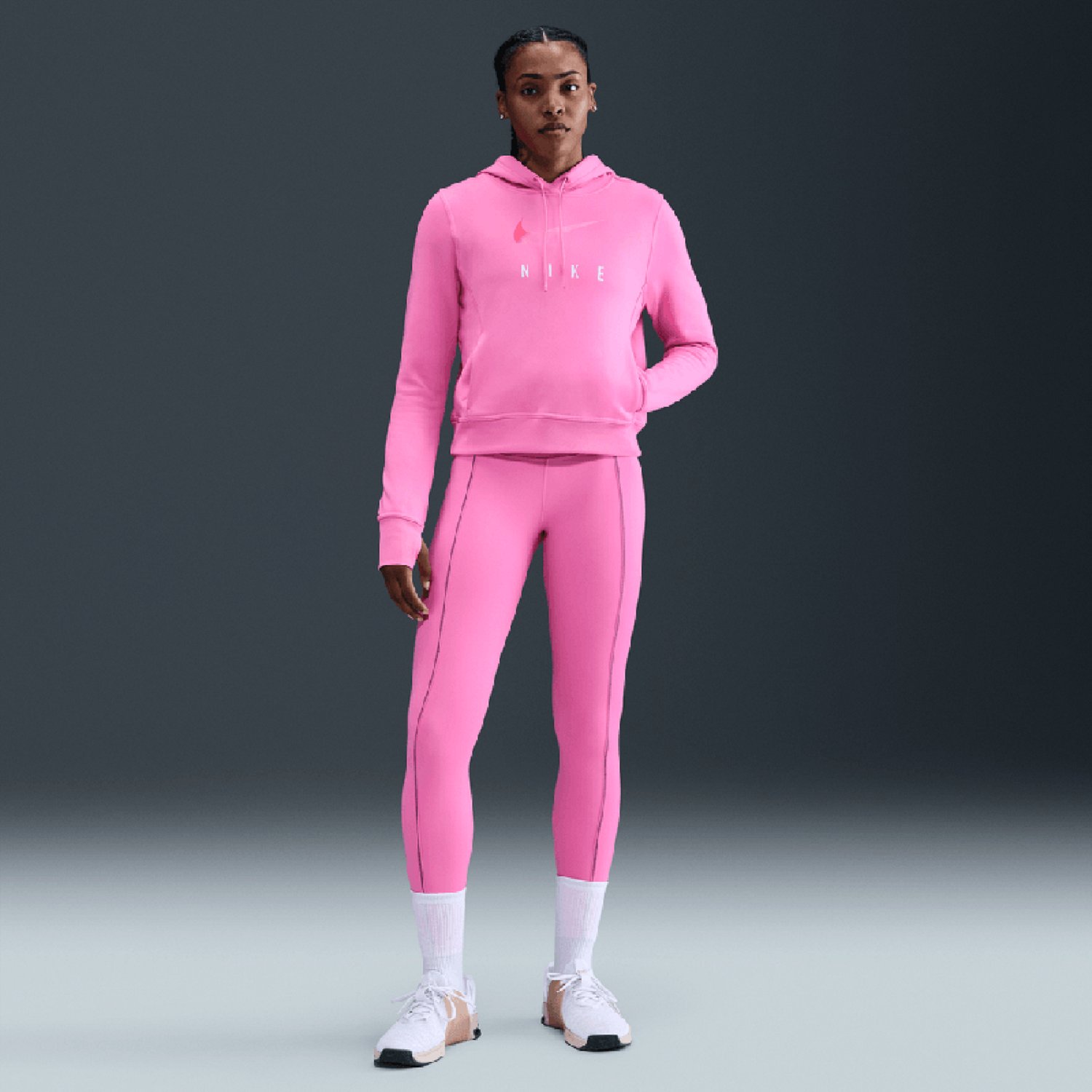 Look your best when you wear the Nike Women's Nike One Therma-FIT Pullover Hoodie. Its body is made of 91% polyester and 9% spandex. The Therma-FIT technology helps keep you warm in cold-weather conditions, and its long sleeves with thumbholes provide additional warmth. The hooded neckline with an adjustable drawcord offers a custom, secure fit.