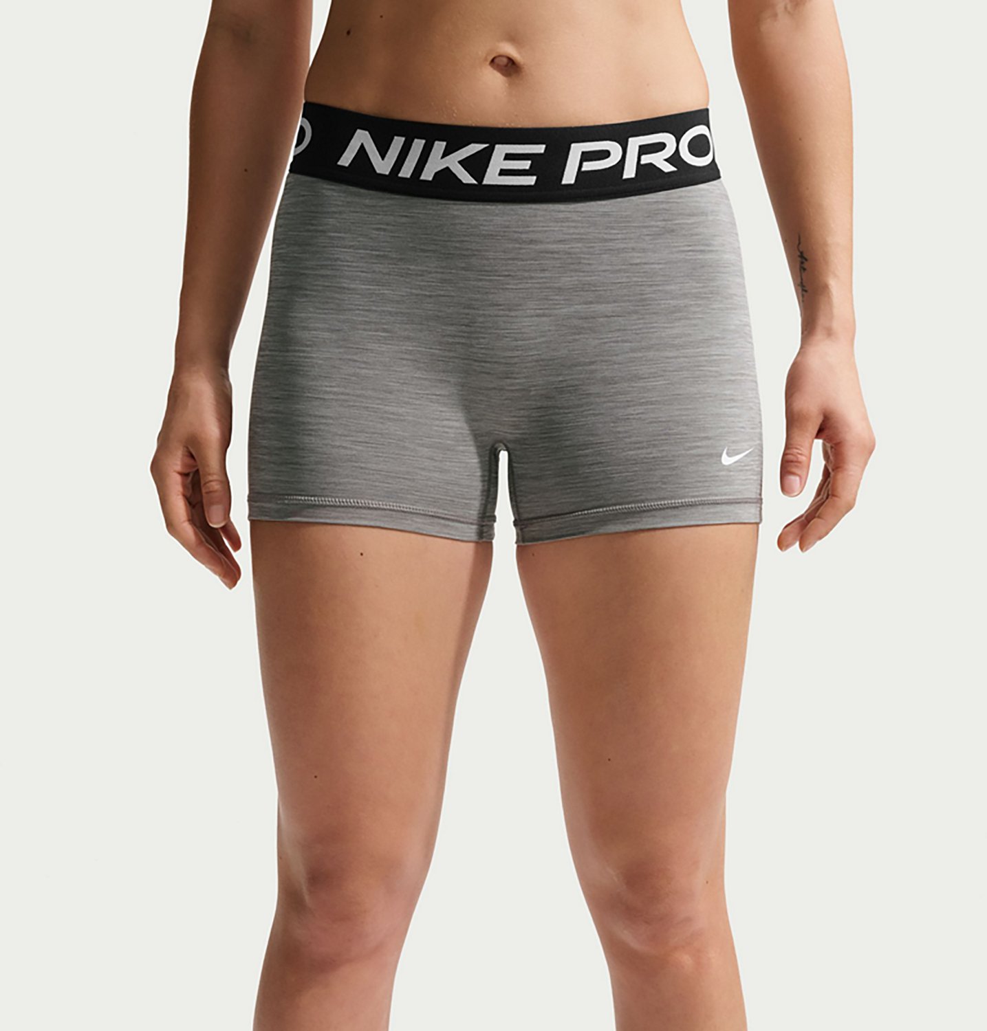 Look your best when you wear the Nike Women's Nike Pro Dri-FIT Mid-Rise Biker Shorts 3 in. Their body is made of 83% polyester and 17% spandex. The Dri-FIT technology wicks away sweat and quickly dries, and their Nike Pro branded elastic jacquard waistband offers a comfortable wear. The absence of a front seam helps keep the fabric from riding up for a smooth fit.