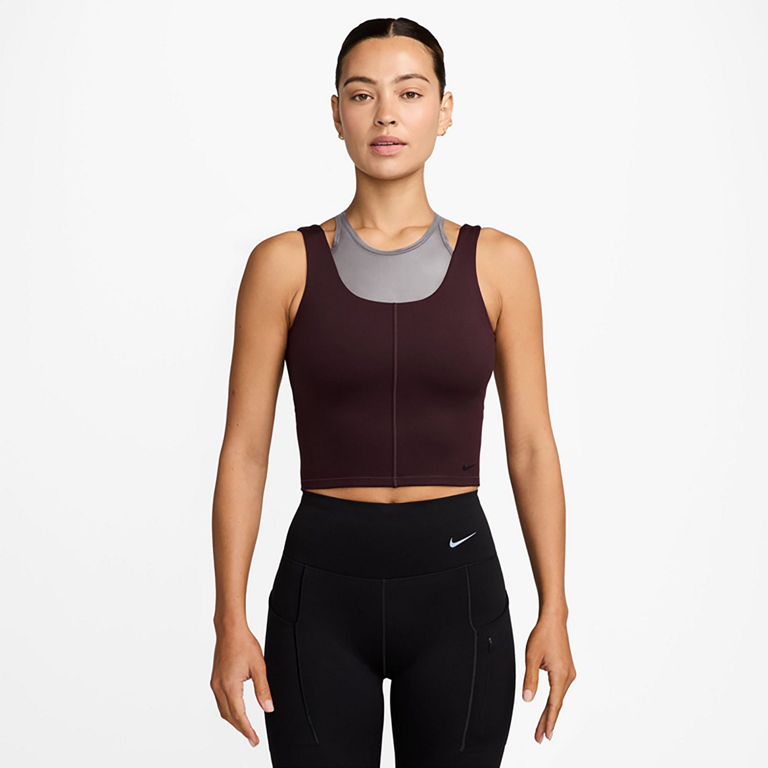 Pair comfort with style by wearing the Nike Women's One Fitted Dri-FIT Cropped Tank Top. The polyester and spandex material provides a comfortable feel, while Dri-FIT technology wicks away sweat to keep you cool and dry. The shelf bra liner offers coverage, and the sheer panel on the chest promotes breathability.