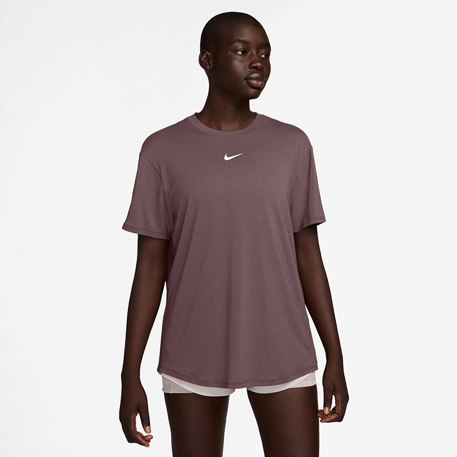 Put on the Nike Women's One Relaxed Dri-FIT Top and take on your training with confidence. This top is made of 81% polyester, 13% cotton and 6% spandex jersey to provide lightweight comfort and wicks moisture thanks to Dri-FIT technology. The curved hem allows ample coverage as you move.