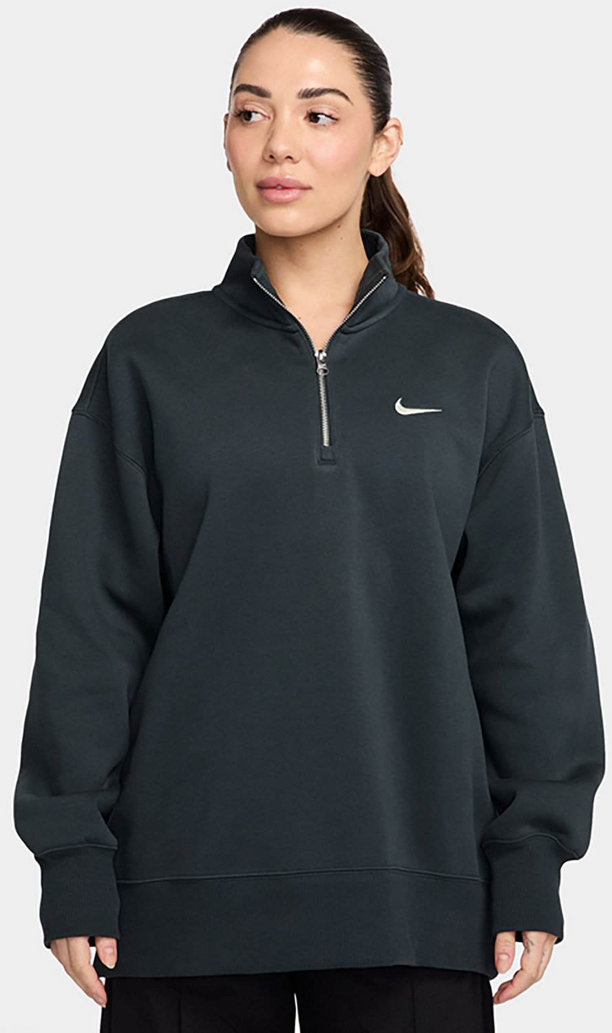Look your best when you wear the Nike Women's Phoenix Fleece Sweatshirt. Its body is made of 80% cotton and 20% polyester. The long sleeves keep you warm, and its 1/4-zip closure offers an adjustable neckline. The dropped shoulders create an oversized look.