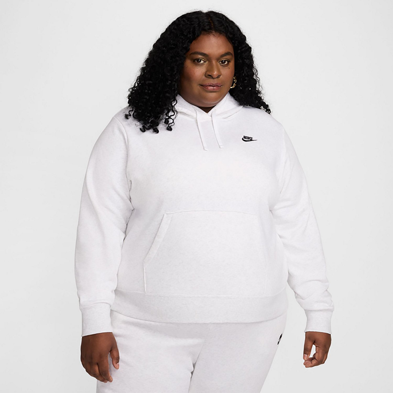 Cozy up in a Nike Women's Plus Club Fleece Pullover Hoodie. This warm pullover is made of a fluffy cotton-polyester club fleece, with a kangaroo pocket and hood for extra comfort. A small Swoosh graphic adds sporty style.