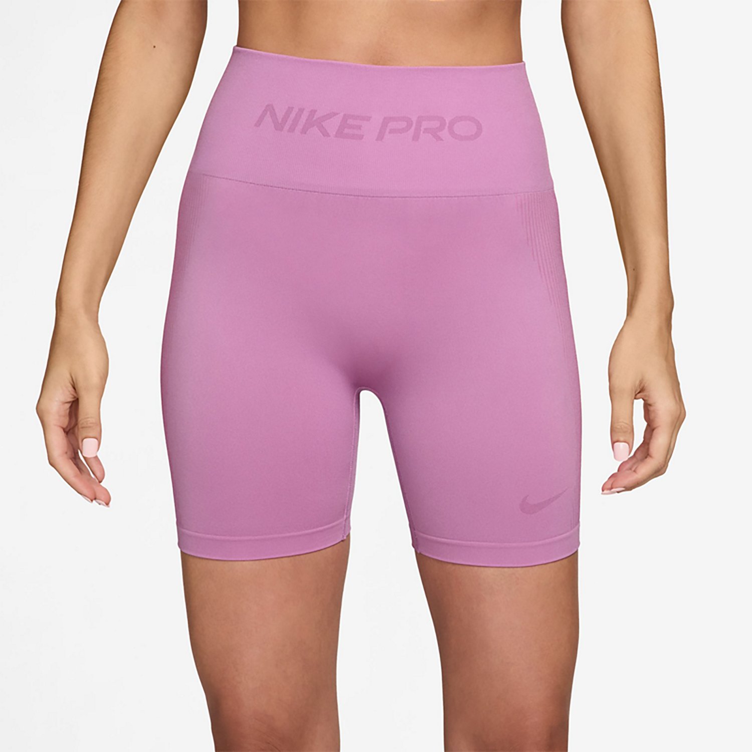 Go for a ride with the Nike Women's Pro Seamless Dri-FIT High-Waisted Biker Shorts 5 in. The polyester blend provides a comfortable feel, while the Dri-FIT technology helps keep you cool and dry. The seamless design delivers a smooth feel, and the strategically placed ribbed zones offer shape.