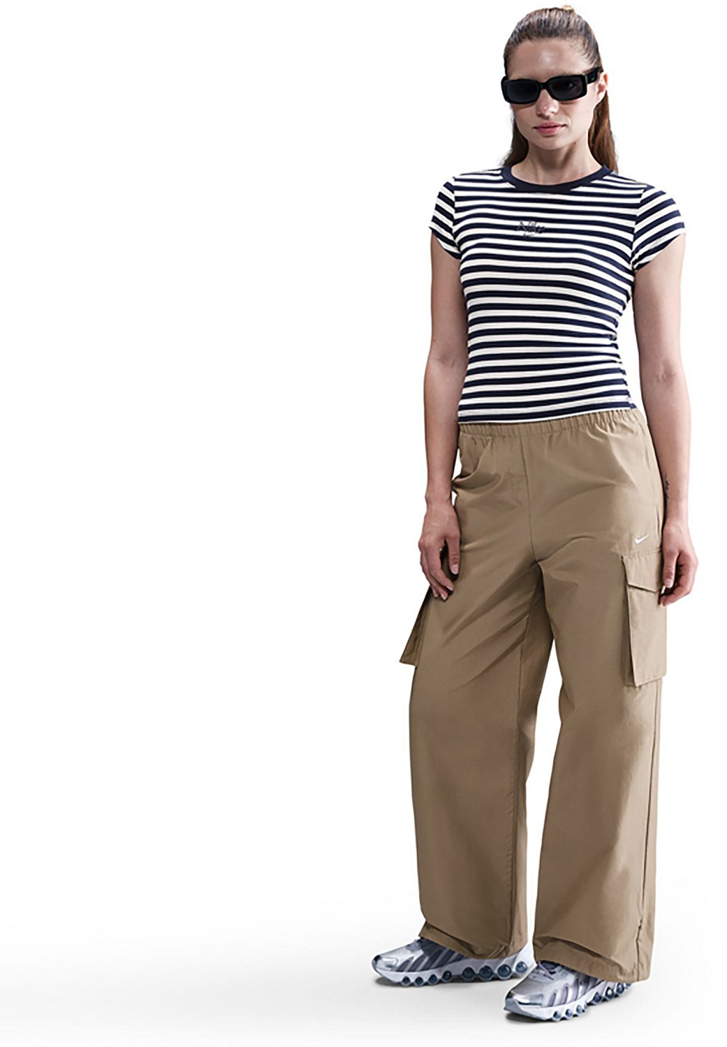 You can make your outfit pop by wearing the Nike Women's Sportswear Baby GFX SPD T-shirt. This tee is striped to add a decorative style and made of 48% modal, 47% cotton and 6% spandex jersey to offer a soft and stretchy design. The body-skimming fit is designed with a slight crop.