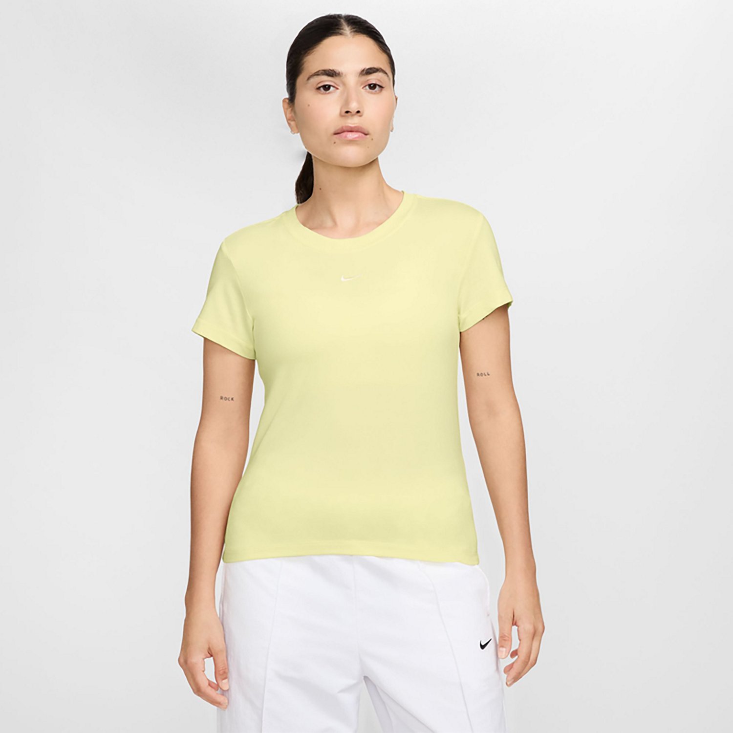 Work out or lounge around in the Nike Women's Sportswear Chill Knit T-Shirt. This comfortable t-shirt is made of a blend of modal, cotton and spandex for a knit stretch that gives you room to breathe and move. The slim fit is slightly cropped and drapes over your body, creating a tailored look.