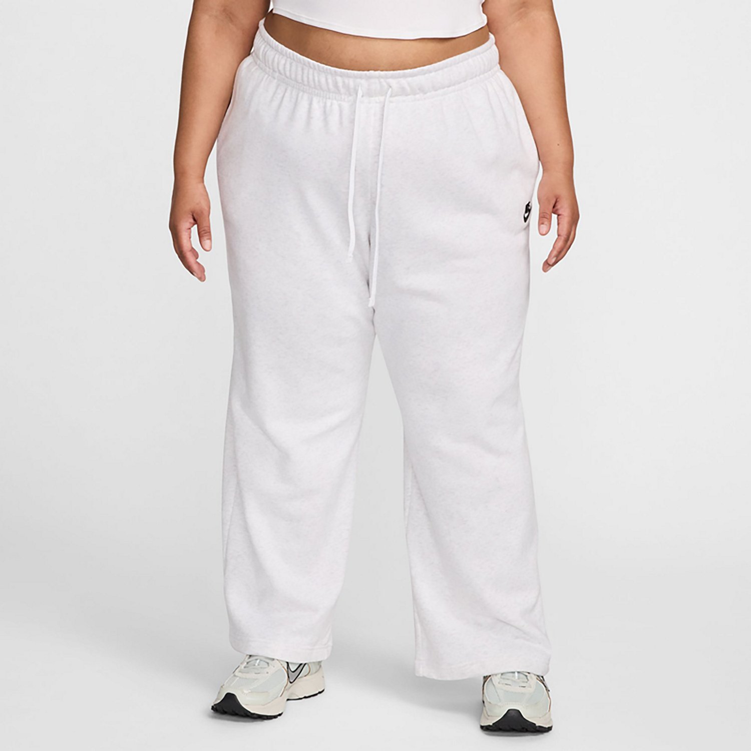 Feel cozy in the Nike Women's Sportswear Club Fleece Mid Rise Wide Leg Plus Size Sweatpants. The cotton and polyester material provides a comfortable feel, while the mid-rise waistband and flat drawstring combo offers a custom fit. The Swoosh logo adds a stylish touch.