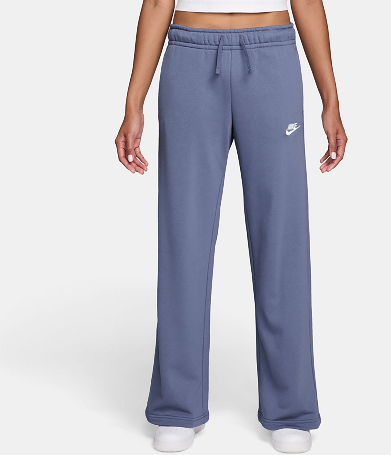 Head out in comfort wearing the Nike Women's Sportswear Club Fleece Mid-Rise Wide-Leg Sweatpants. These wide leg sweats are made of cotton and polyester fleece for comfort and softness. The mid-rise waistband with flat drawstring allows for a secure fit, while the embroidered Futura logo adds sporty style.
