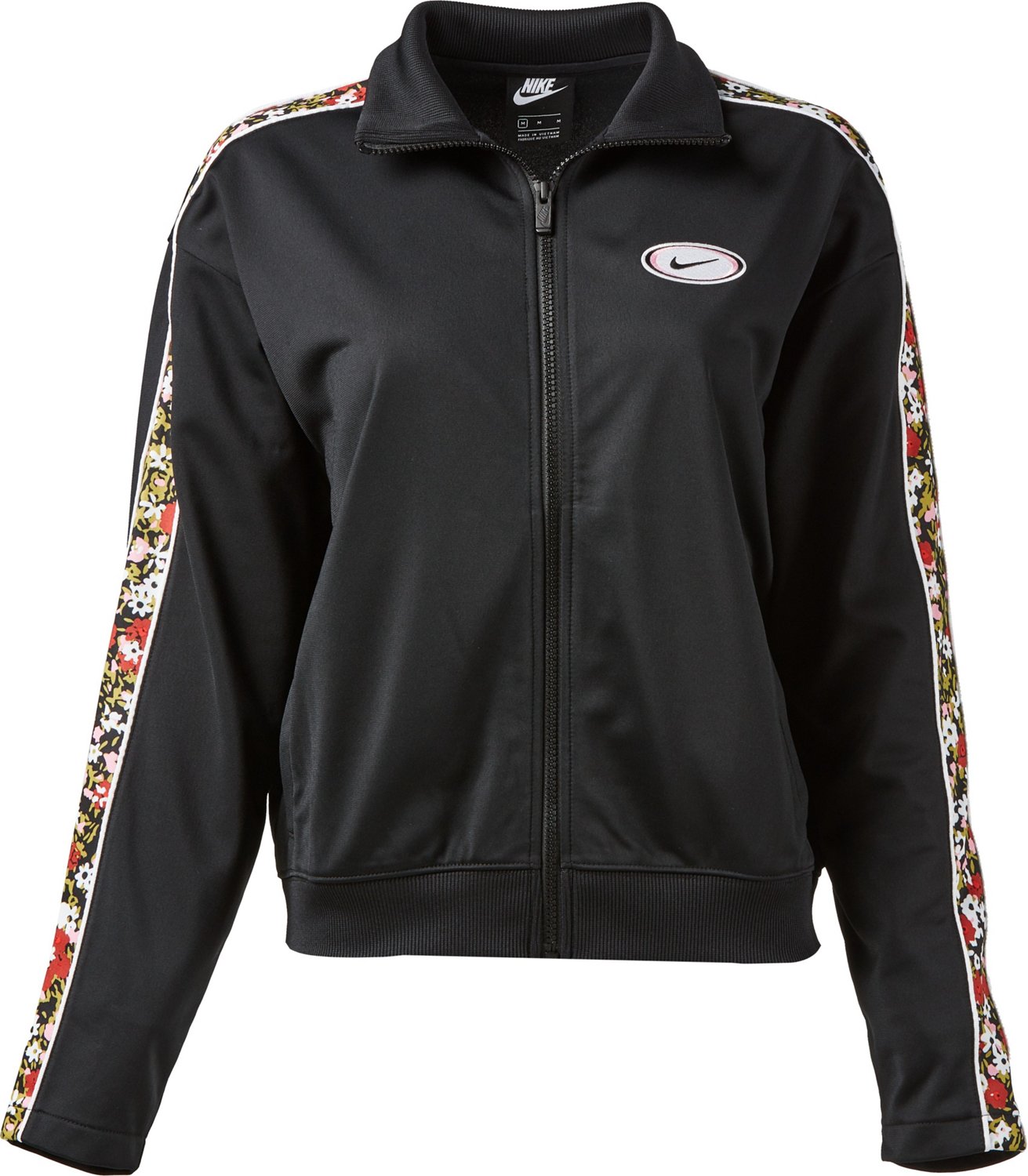Show off your sporty style in the Nike Women's Sportswear Femme Jacket. This jacket is made from 100% polyester material for soft, lightweight wear, and it features a classic track jacket silhouette and a zip-up style. The throwback print on the shoulder seams adds a retro look.