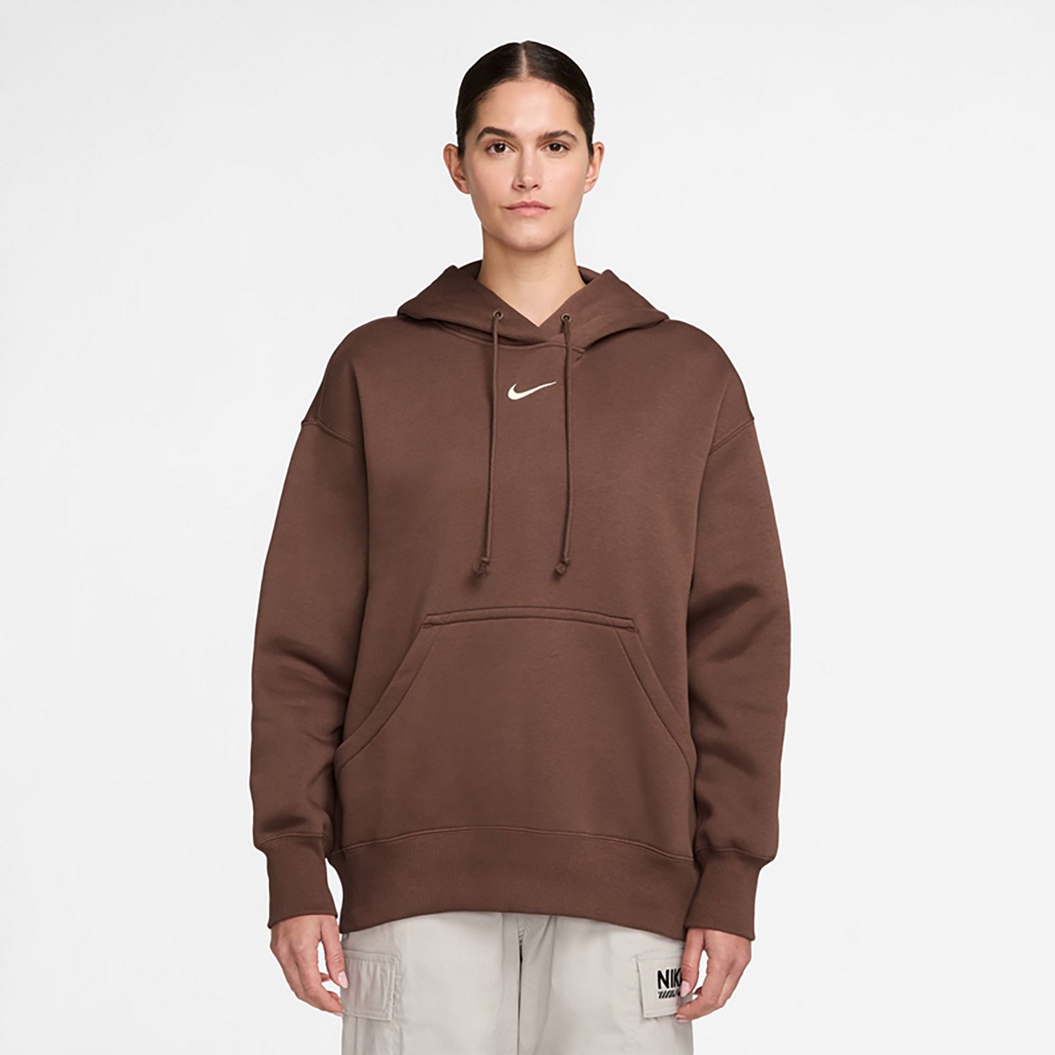 Kick back and relax with the Nike Women's Sportswear Phoenix Fleece Oversized Pullover Hoodie. The cotton and polyester material provides a comfortable feel, while the midweight brushed fleece interior offers warmth. The hood and drawstring combo delivers coverage.