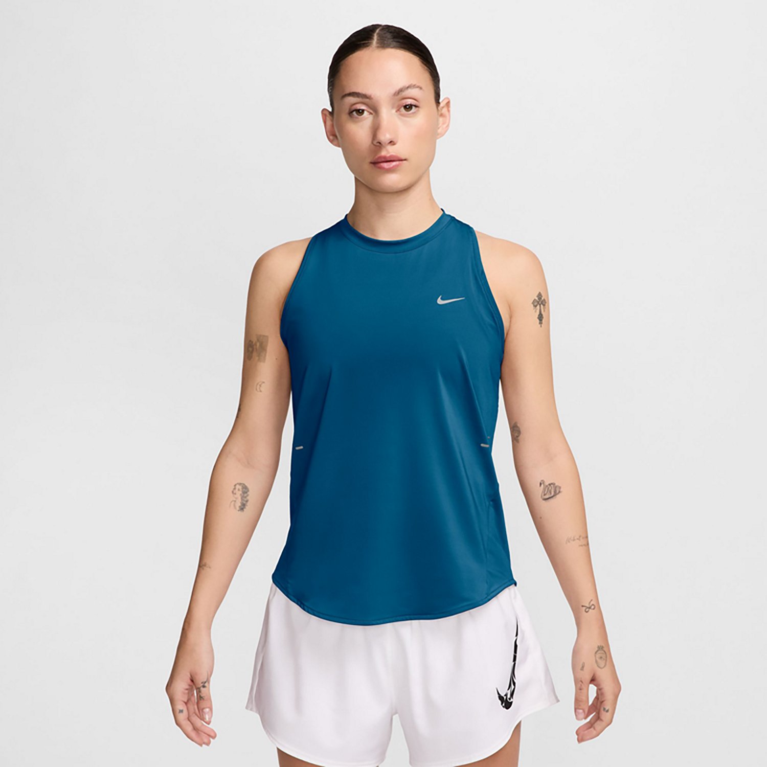 Give it your all in the Nike Women's Swift Dri-FIT Running Tank Top. The polyester and spandex material provides a comfortable feel, while the Dri-FIT technology wicks away sweat to keep you cool and dry. The curved hem offers coverage, and the reflective graphics promote visibility.