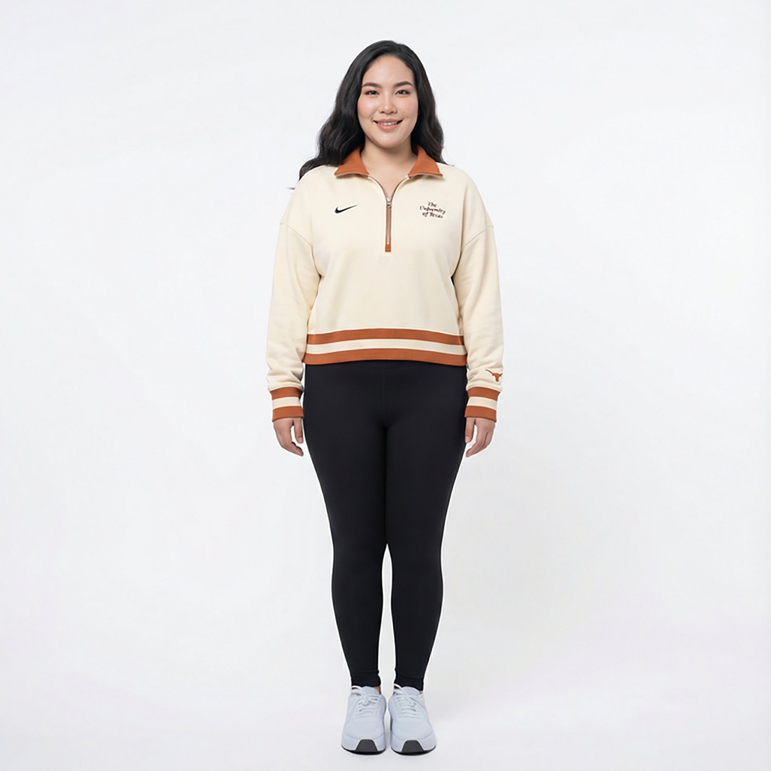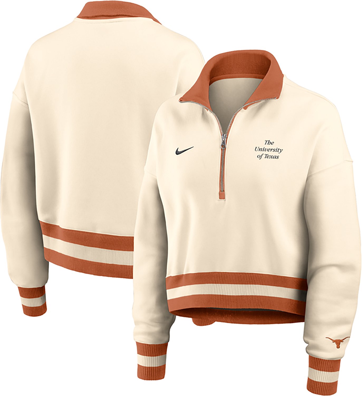 Root for your favorite team when you wear the Nike Women's Texas Longhorns Legacy Fleece Crop 1/4 Zip Jacket. It is made of 73% cotton, 18% recycled polyester, and 9% organic cotton. The midweight brushed fleece provides a soft, warm feel, and its dropped shoulder seams create a roomy wear. The Texas Longhorns graphics show off your team spirit.
