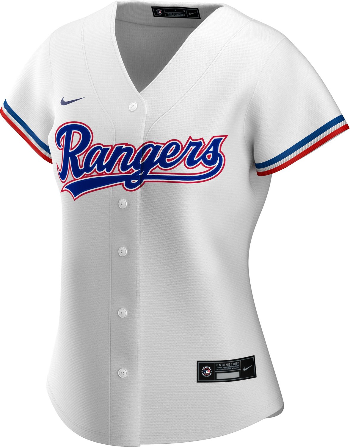 Show your support for the Rangers in the Nike Women's Texas Rangers Official Replica Jersey. This replica jersey is made of 100% polyester offset mesh for durability and breathability and features a button-down, V-neck style. The official Rangers team logo shows your team spirit.